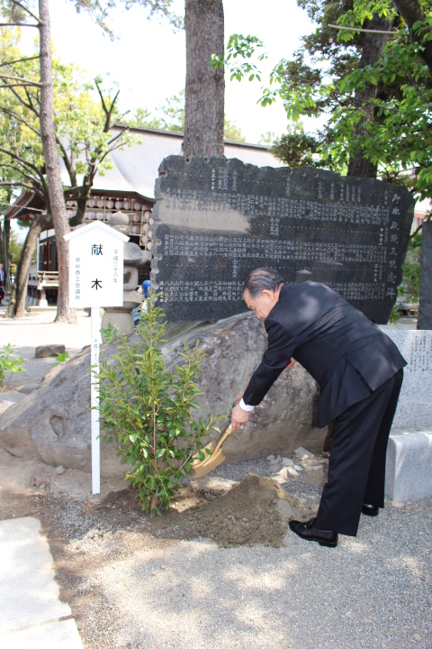 近年は、当所関係者のほか、甲府市観光協会、甲府商店街連盟なども関わるようになり、稲積神社「正の木祭り」の一環の神事として植樹を行っています。