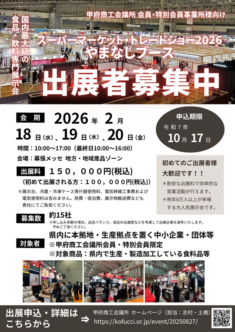 ※やまなしブース独自の小間割りとなります。申込方法 こちらをクリックし、Google formよりお申込ください。 出展申込期限 令和7年10月17日(金)まで 本件問合せ 甲府商工会議所 中小企業振興部 担当:志村・土橋