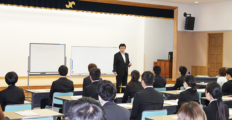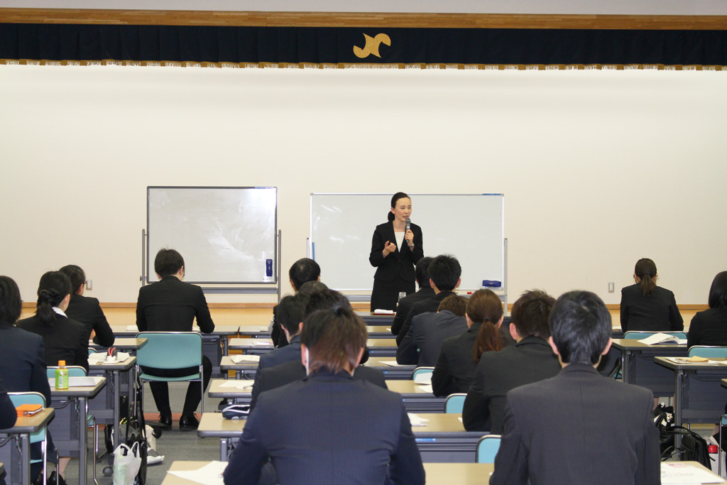 1日目は、グローアップ教育センター 代表 西澤浩二 氏が、社会人としての心構えや会社や組織の仕組みについて解説、後半はグループディスカッションを行った。2日目は、(株)ファースト企画 木村由紀子 氏があいさつ・名刺交換・接客マナー・電話応対など、ロールプレイングを取り入れた研修を行った。初めは受講者も緊張した面持ちであったが、次第にディスカッションやロールプレイングで雰囲気もほぐれると、新入社員らしいさわやかなあいさつが会場に響いた。