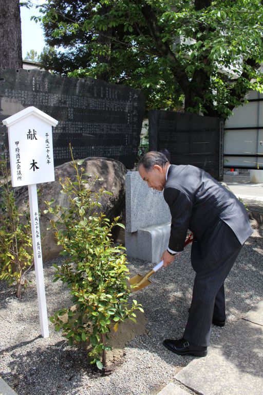 5月2日、毎年恒例の「献木祭」を稲積神社(甲府市太田町)にて開催した。当日は、当所役員・議員ら50名余りが出席。神事に続いて、金丸会頭や樋口市長らは境内に榊(サカキ)の木を植樹し、商工業の発展を祈願した。