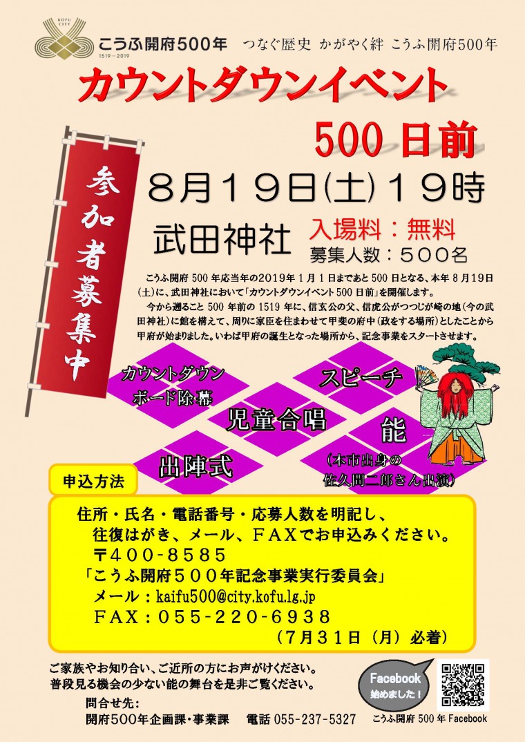 「こうふ開府500年応当年の2019年1月1日まであと500日前となる、8月19日(土)に、武田神社において「カウントダウンイベント500日前」を開催します。