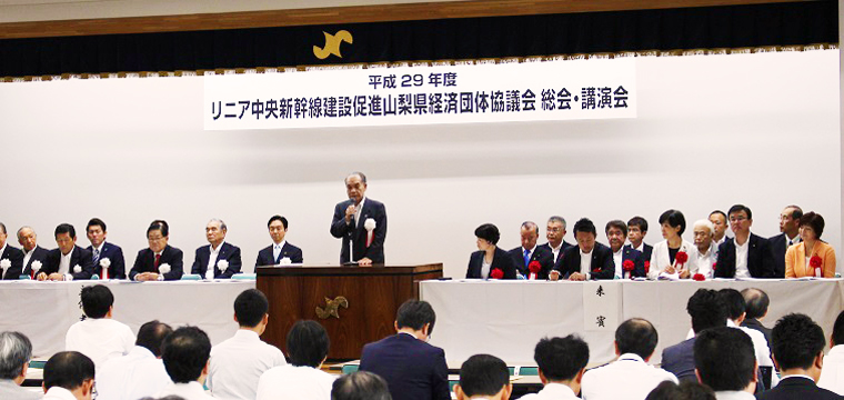 去る7月12日、当所が事務局を務めるリニア中央新幹線建設促進山梨県経済団体協議会(会長 当所金丸会頭)の平成29年度総会が、当所ホールにて開催された。