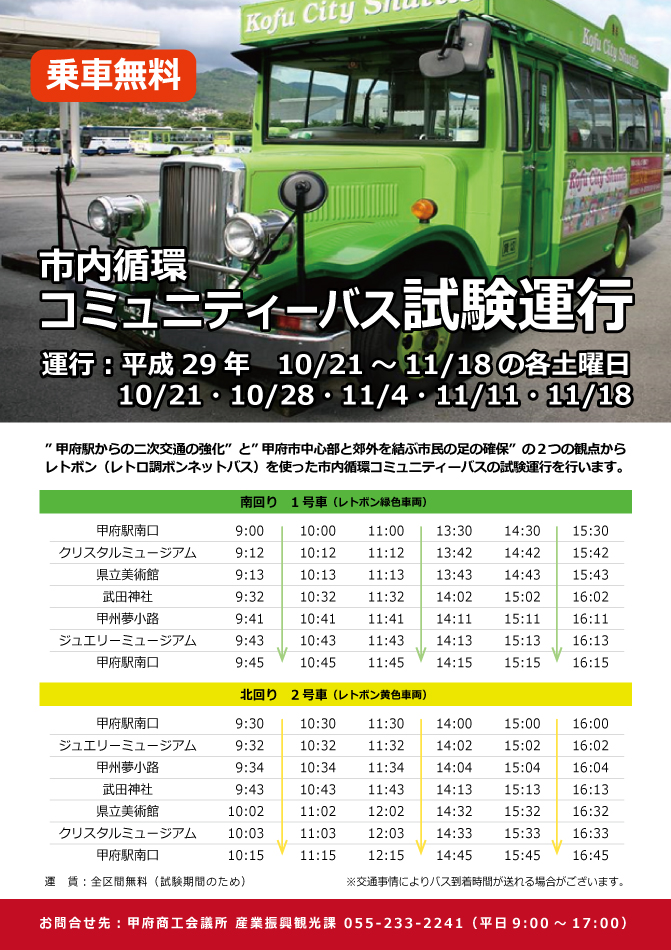 当所所有のレトボンを利用し、” 甲府駅からの二次交通”と” 甲府市中心部と郊外を結ぶ市民の足”のニーズを調査するため、甲府市内循環コミュニティーバスの試験運行を実施することとなりました。