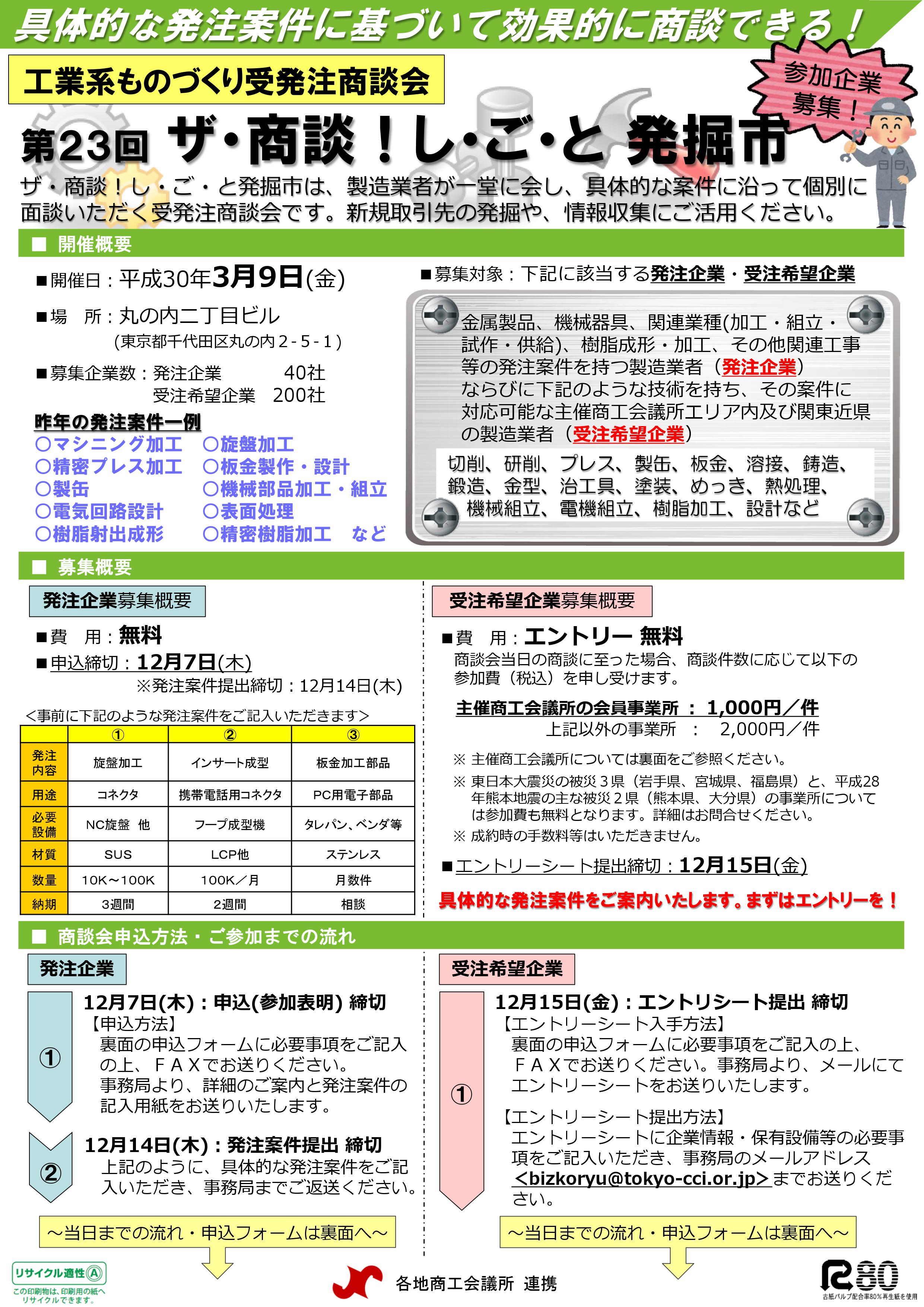 2018年3/9(金)東京・丸の内二丁目ビルで開催されます工業系ものづくり受発注商談会「ザ・商談!しごと発掘市」についてご案内します。