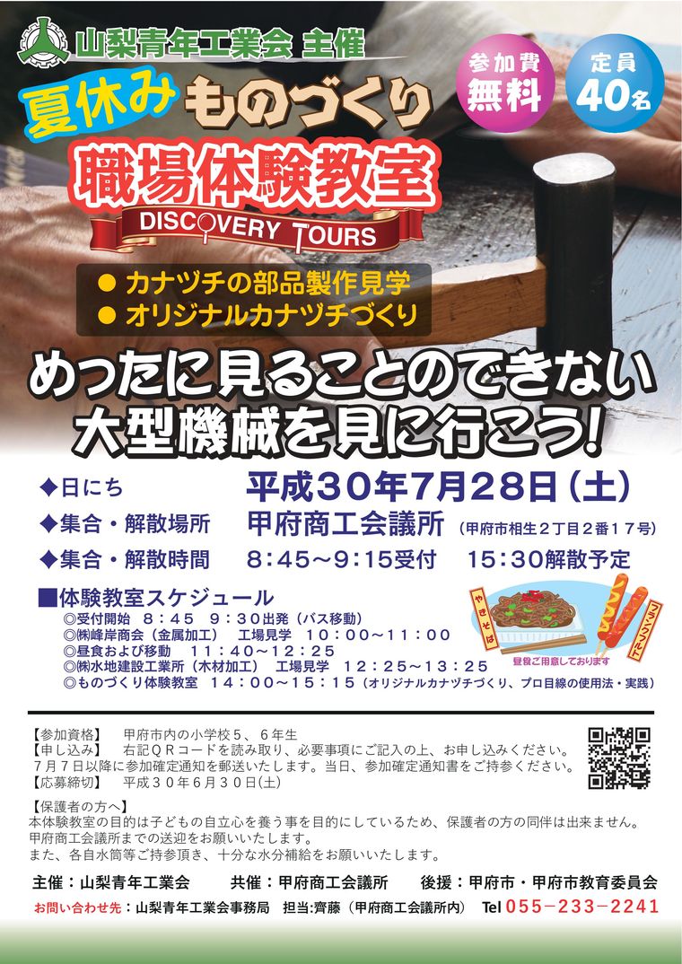 山梨青年工業会(事務局:甲府商工会議所)は、子ども達のものづくりへの興味・関心を高め、将来甲府市のものづくり産業の基盤を支える後継者の育成を図る事業として「夏休み ものづくり職場体験教室」を開催します。当事業は、毎年7月・11月に実施してきた「親子ものづくり職場体験教室」のノウハウを活用し、よりものづくりへの関心を抱いてもらうため「見学型」と「体験型」を組み込んで実施します。