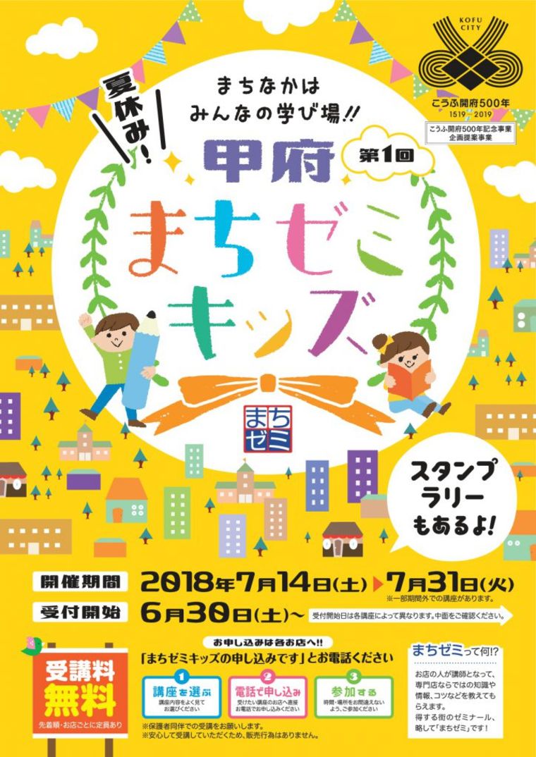 甲府まちゼミキッズ実施グループ(事務局:LLCまちづくり甲府)は、甲府中心街で毎年2月に開催している「甲府まちゼミ」が大好評につき、夏休みに合わせ、子供向けまちゼミ「甲府まちゼミキッズ」を開催します。