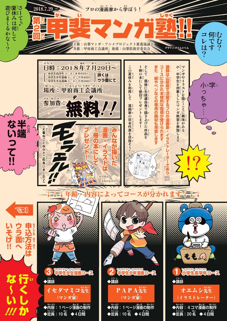 講師 オエムシくん(イラストレーター・男性?) 内容 4コママンガの製作 日数 8月6日(月)、8日(水)、9日(木)、10日(金) 10時~12時 4日間 場所 甲府商工会議所5階多目的ホール 中学生・少年漫画コース