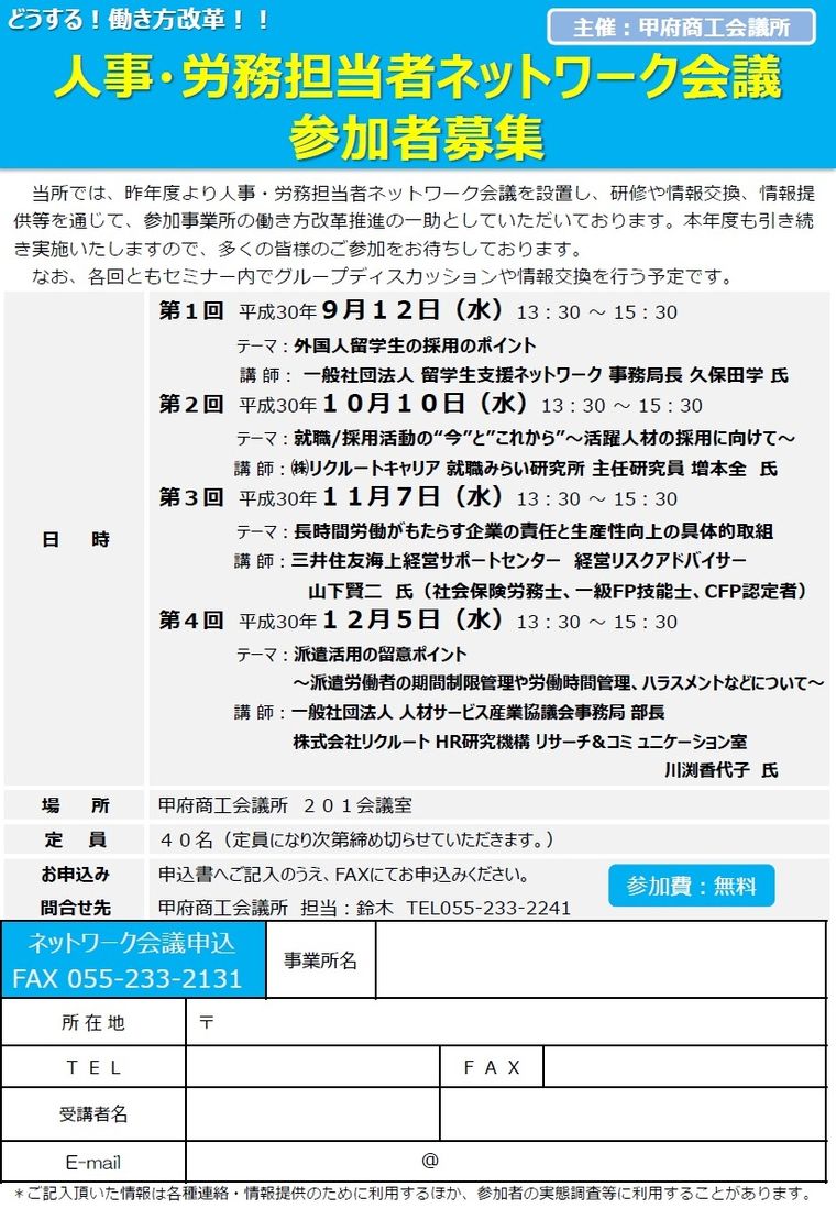 当所では、昨年度より人事・労務担当者ネットワーク会議を設置し、研修や情報交換、情報提供等を通じて、参加事業所の働き方改革推進の一助としていただいております。本年度も引き続き実施いたしますので、多くの皆様のご参加をお待ちしております。