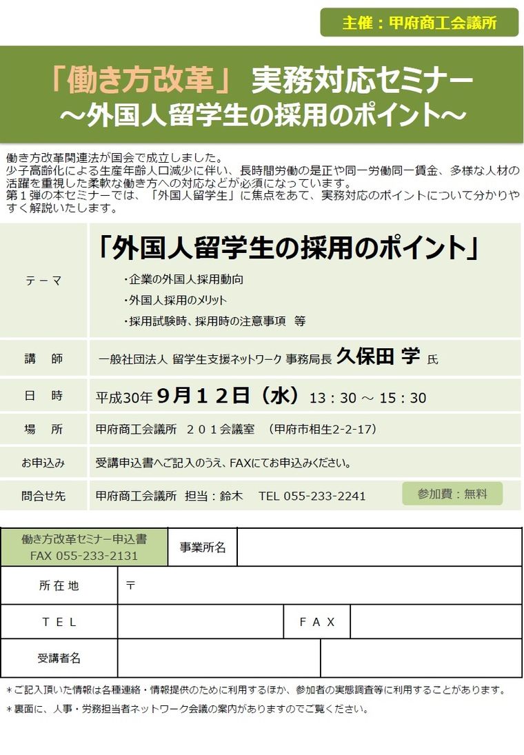 【9/12】「働き方改革」実務対応セミナー ~外国人留学生採用のポイント~ 開催のご案内