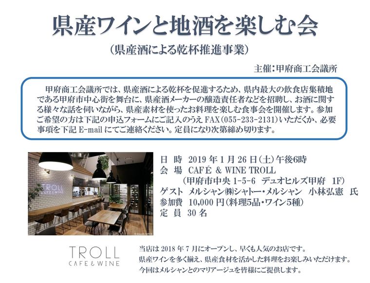 日時 2019年1月26日(土)午後6時 会場 CAFÉ & WINE TROLL (甲府市丸中央1-5-6 デュオヒルズ甲府 1F) ゲスト メルシャン㈱シャトー・メルシャン 小林 弘憲 氏 参加費 10,000円(料理5品・ワイン5種) 定員 30名 申込方法 ①チラシ申込欄をご記入の上、FAX(055-233-2131)もしくは