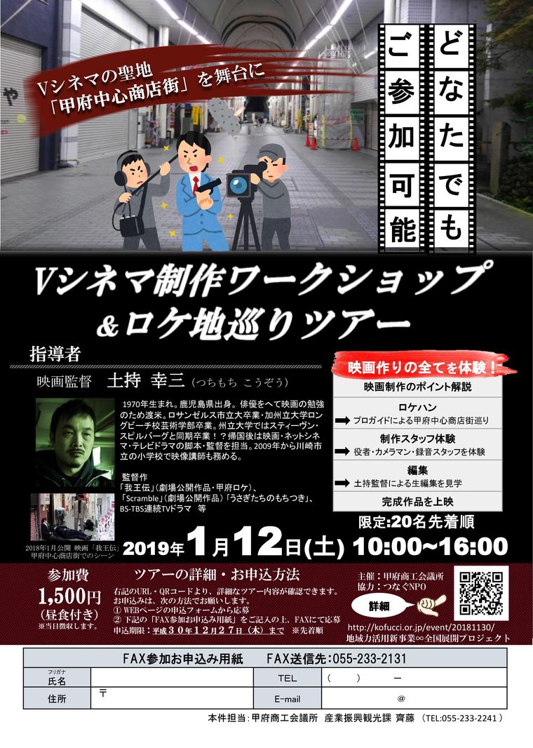 甲府商工会議所は、平成31年1月12日(土)に「Vシネマ制作ワークショップ&ロケ地巡りツアー」を初開催します。