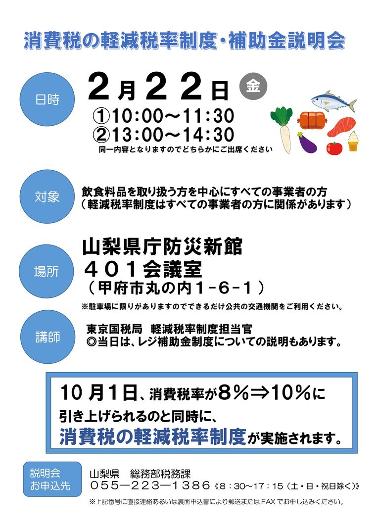 2月22日(金)に、「消費税の軽減税率制度・補助金説明会」が山梨県防災新館で開催されます。
