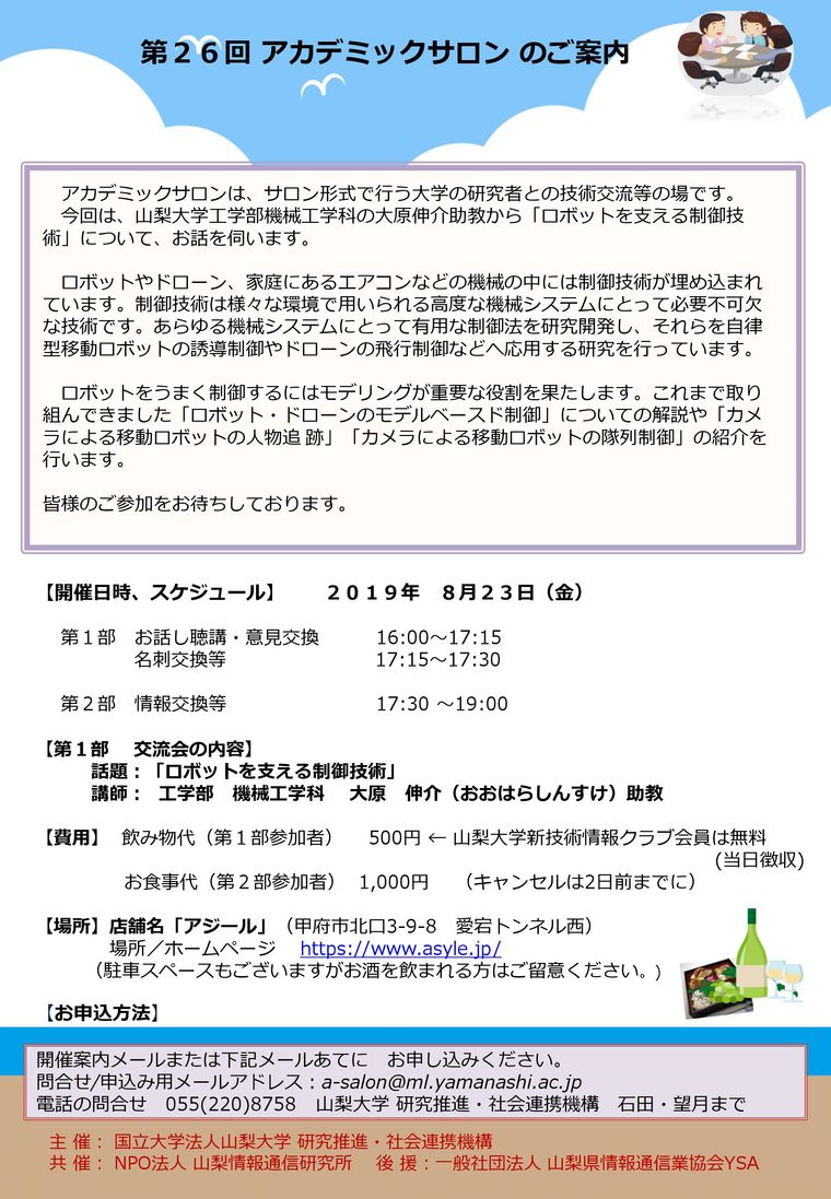 アカデミックサロンは、サロン形式で行う大学の研究者との技術交流等の場です。今回は、山梨大学工学部機械工学科の大原伸介助教から「ロボットを支える制御技術」について、お話を伺います。皆様のご参加をお待ちしております。