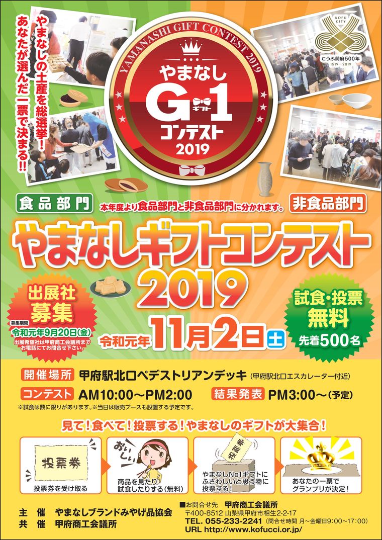 山梨の魅力が詰まった商品をお待ちしております!開催日 令和元年11月2日(土)午前10時~午後2時 会場 甲府駅北口ペデストリアンデッキ 募集内容 「やまなし」ならではのお土産品 参加対象 山梨県内の事業者 募集期間 令和元年9月20日(金) 応募方法 下記の応募用紙に必要事項を記入の上、FAXにてお送りください。