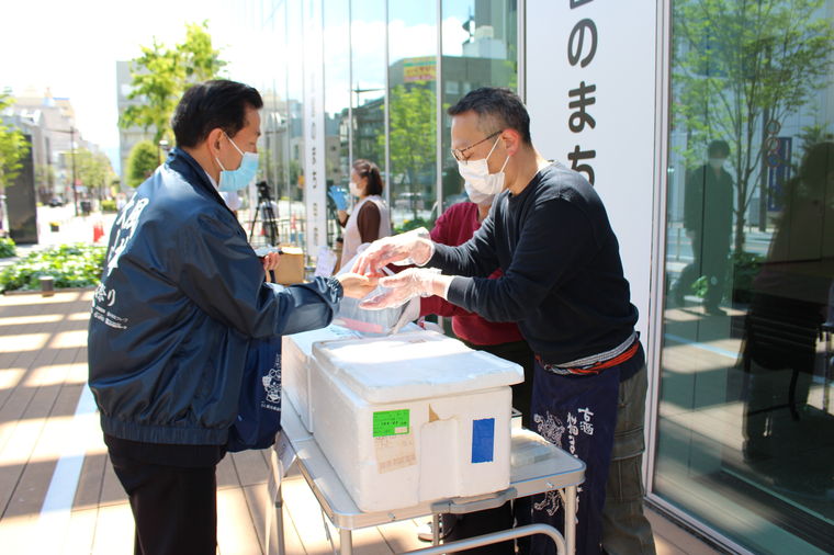甲府商工会議所では、テイクアウトに対応している飲食店を支援する取組みとして、「オフィス de ランチ」を始めました。当取組みは、甲府市役所に特設スペースを設けて、各店が事前に予約を受けた弁当を近隣で勤務する方やお住いの方に受け渡しを行うものです。市中心部に店舗を一堂に集めてPRすることで、新型コロナウイルスの感染終息後の集客につなげるとともに、売り上げが減少している飲食店への応援企画として実施しています。