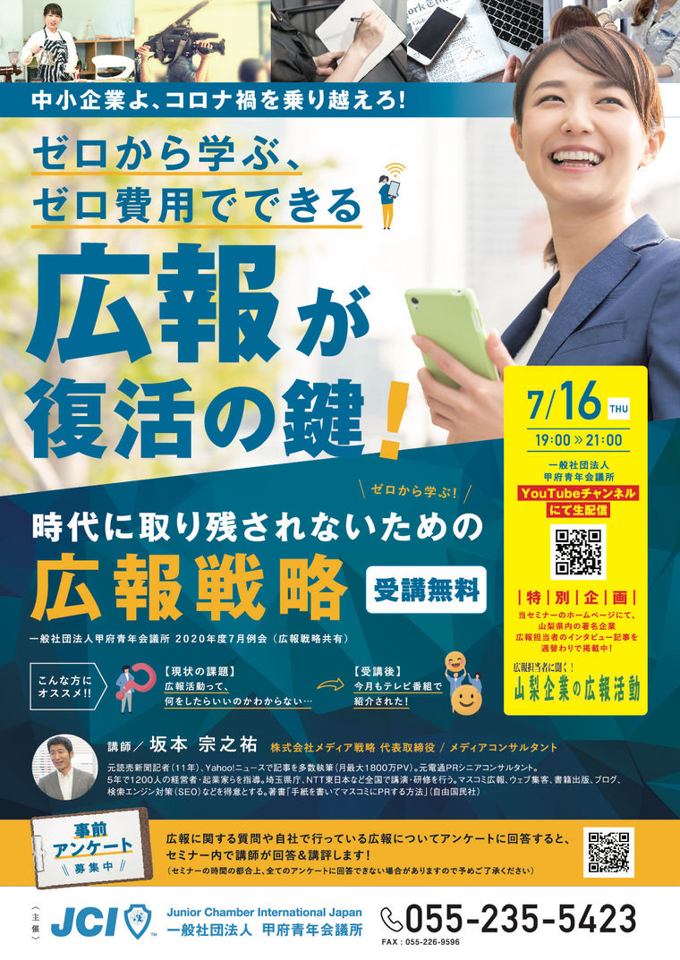 企業の広報担当者様にとっては、他社の取り組みを知る機会となるとともに、広報の専門家に質問できる貴重な機会となります。是非参加をご検討ください。日時 2020-07-16 19:00~21:00 場所 Webセミナー(甲府青年会議所HPからYouTube liveにより配信) 講師 坂本 宗之祐 氏 (㈱メディア戦略 代表取締役) 備考 広報活動に関する事前質問・お悩み相談を受け付けています。