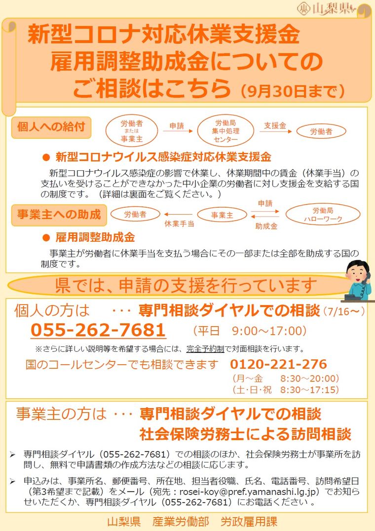 【山梨県】新型コロナウイルス感染症対応休業支援金の 相談窓口の開設について