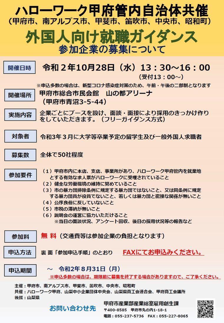 ハローワーク甲府管内自治体(甲府市・南アルプス市・甲斐市・笛吹市・中央市・昭和町)では、共催で「留学生・外国人求職者向け就職ガイダンス」を令和2年10月28日(水曜日)に甲府市総合市民会館(山の都アリーナ)で開催します。
