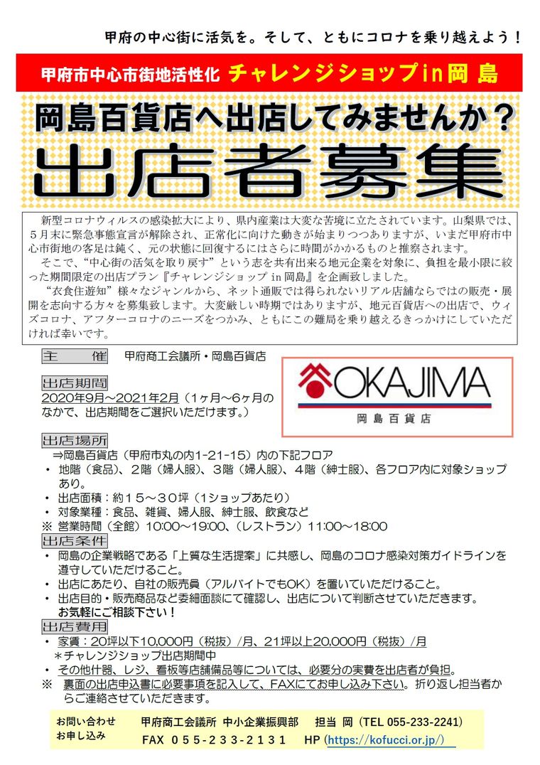 “衣食住遊知”様々なジャンルから、ネット通販では得 られないリアル店舗ならではの販売・展開を志向する方 々を募集致します。大変厳しい時期ではありますが、地元百貨店への出店で、ウィズコロナ、アフターコロナのニーズ をつかみ、ともにこの難局を乗り越えるきっかけにしていただければ幸いです。出店期間 令和2年9月~令和3年2月(1カ月~6カ月のなかで、出店期間をご選択いただけます。) 出店場所 岡島百貨店内(甲府市丸の内1-21-15)の下記フロア 詳 細 ・地下(食品)、2階(婦人服)、3階(婦人服)、4階(紳士服)
