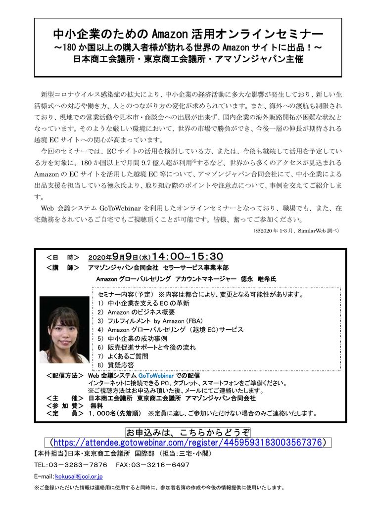 ※ご視聴方法はお申込み頂いた後、メールにてご連絡いたします。主 催 日本商工会議所、東京商工会議所、アマゾンジャパン合同会社 参 加 費 無料 定 員 1,000名(先着順)※定員に達し、ご参加頂けない場合のみご連絡いたします。 申 込 https://attendee.gotowebinar.com/register/4459593183003567376 ご 案 内 https://www.jcci.or.jp/international/flyer-seminar-200909.pdf お問い合わせ