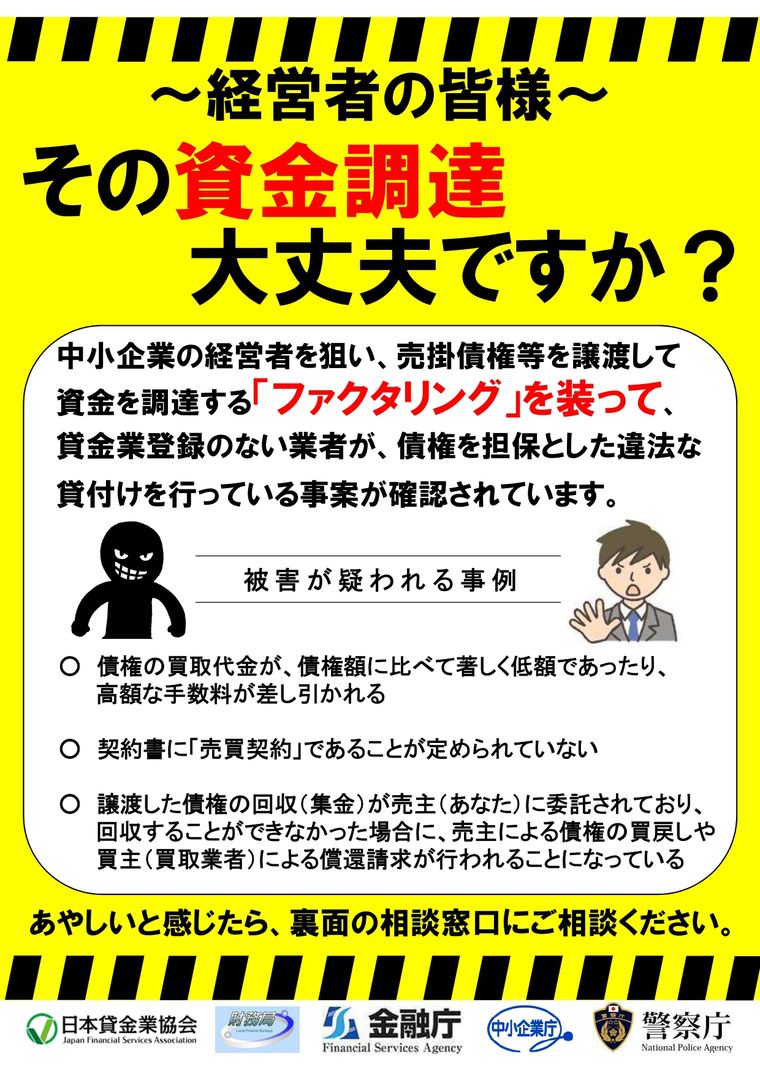 また、「事業者向けファクタリング」についても、経済的に貸付けと同様の機能を有していると思われるようなものは貸金業に該当するおそれがあります。