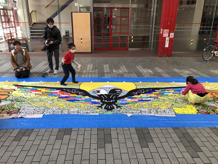 12月12日(土)、13日(日)に甲府中心商店街にて「幕絵彩色ワークショップ」を実施しました。幕絵は、疫病退散を祈念した「アマビエ」と商売繁盛を願った「ヨゲンノトリ」の2枚に色塗りを行いました。参加者数は、両日合わせて33名。参加者は、大きな幕に自分の好きな色を描き親子で楽しみながらイベントに取り組んで頂きました。