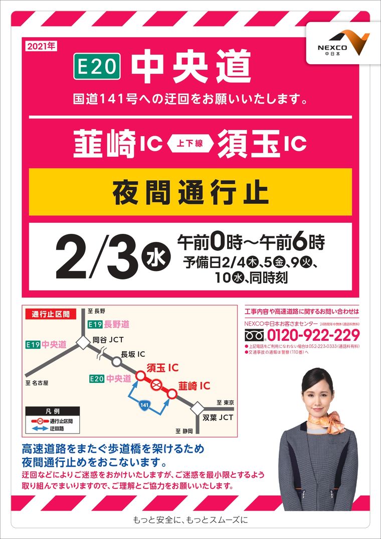 2月3日(水)午前0時~午前6時にかけて、韮崎IC-須玉IC区間は上下線とも夜間通行止となります。お出かけの際はご注意ください。