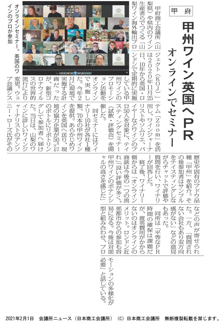 新型コロナウイルス感染症の影響により2020年11月25日にオンラインで実施した「山梨ワイン海外輸出プロジェクト(KOJ)」が日本商工会議所「会議所ニュース」(2021年2月1日発行)の紙上で紹介されました。