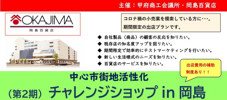 今般、(第1期2020 9 月~ 2021 2 月 )チャレンジショップの出店者並びにお客様の声を聞きながら、内容を大幅に見直し、(第2期)『チャレンジショップ in 岡島』を企画致しました。 今期は、甲府商工会議所の会員企業には、出店費用の補助などを加え、岡島百貨店の各種サービスの取扱いもできるようにしました。