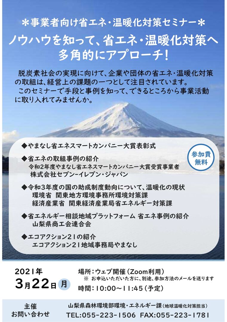 脱炭素社会の実現に向けて、企業や団体の省エネ・温暖化対策の取組は、経営上の課題の一つとして注目されています。このセミナーで手段と事例を知って、できるところから事業活動に取り入れてみませんか。