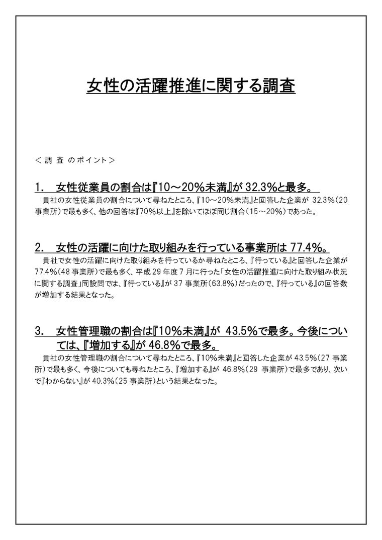 平成28年4月に女性活躍推進法(正式名称:女性の職業生活における活躍の推進に関する法律)が施行されるなど、今後さらなる女性の活躍が期待されているなかで、県内事業所の女性の活躍に向けた取り組みをどれほど行っているかについて、調査を実施しました。
