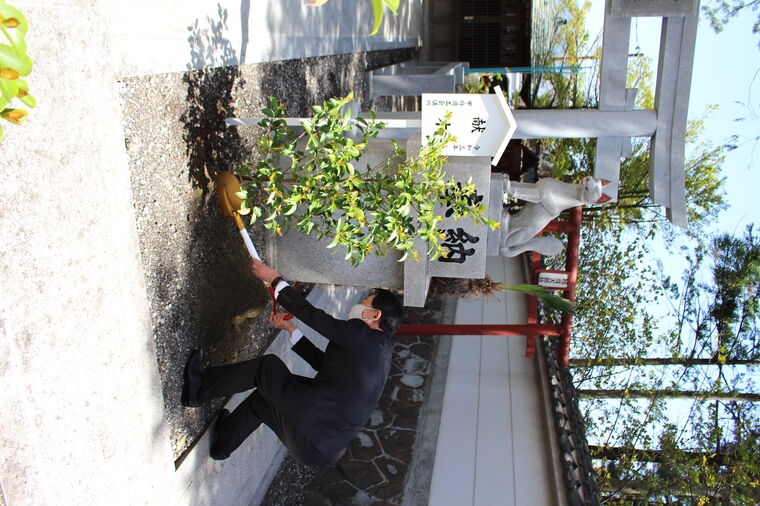 甲府商工会議所では4月30日(金)に、稲積神社(甲府市太田町)にて毎年恒例の「献木祭」を実施しました。当日は当所役員・議員が出席し、神事に続いて、進藤会頭や樋口市長らは境内に本榊(ホンサカキ)の木を植樹し、商工業の発展を祈願しました。