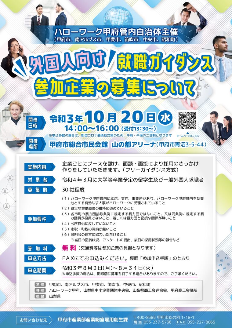 甲府市は、ハローワーク甲府管内自治体(南アルプス市、甲斐市、笛吹市、中央市、昭和町)と合同で、留学生及び外国人一般求職者とハローワーク甲府管内企業とのマッチングを目的とする「外国人向け就職ガイダンス」を開催します。参加料は無料となっておりますので、企業の皆様のご参加をお持ちしています。