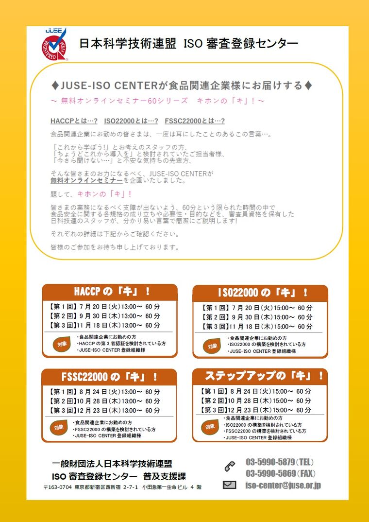 ● ISO22000の認証を受けるには会場 オンライン 参加費 無料 講師 一般財団法人日本科学技術連盟 ISO審査登録センター