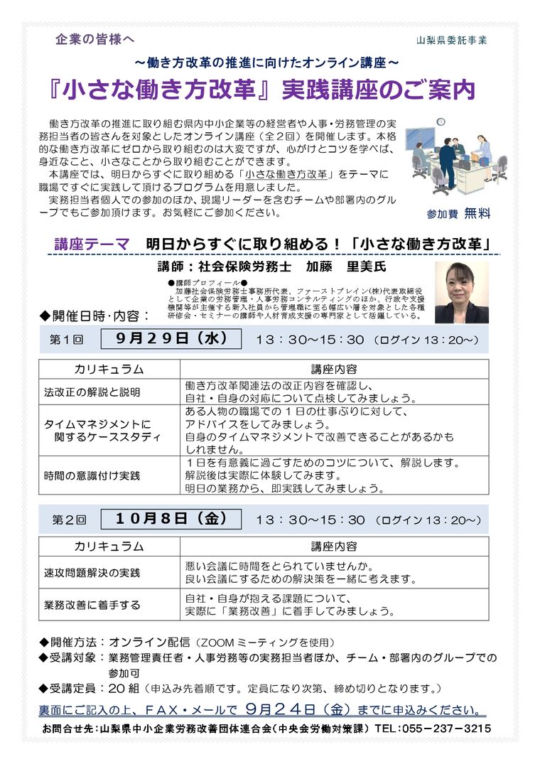 【山梨県】「小さな働き方改革」実践講座のご案内