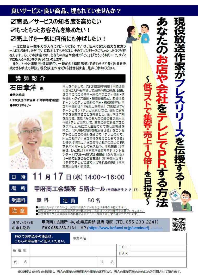 【11/17】セミナー「現役放送作家がプレスリリースを伝授する!あなたのお店や会社をテレビでPRする方法」のご案内