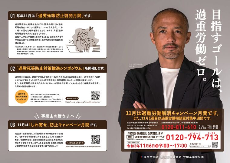厚生労働省では、長時間労働の削減を始めとする働き方の見直しに向けた取組を推進するため、昨年に引き続き、10月を「年次有給休暇取得促進期間」、11月を「過重労働解消キャンペーン」期間と定め、集中的な周知啓発等を行っています。