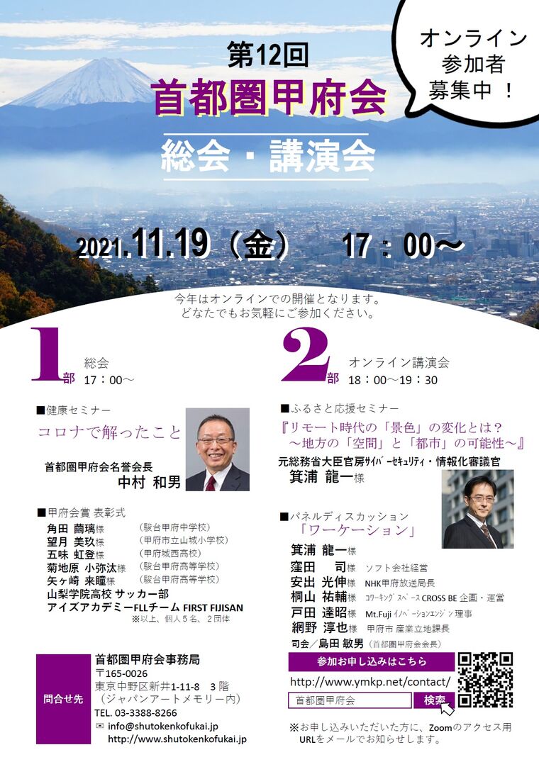 ※お申込みいただいた方に、Zoomのアクセス用URLがメールにて通知されます。参加費 無料 問合先 首都圏甲府会事務局 ☎03-3388-8266