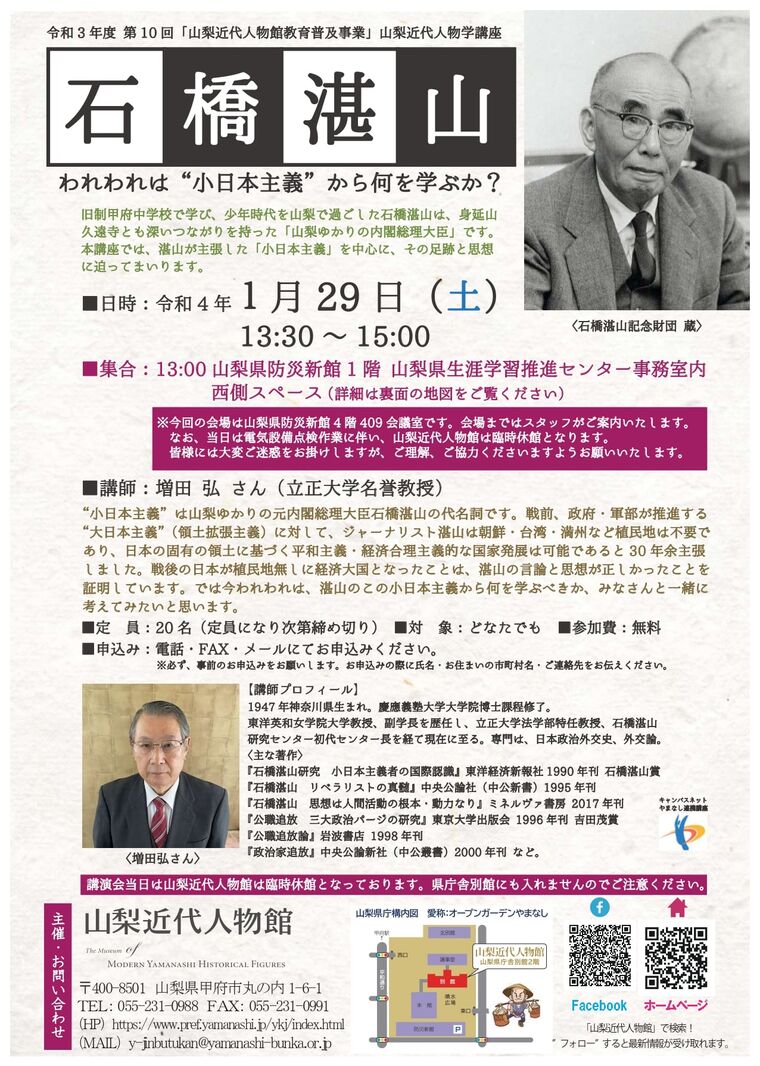 本講座では、湛山が主張した「小日本主義」を中心に、その足跡と思想に迫ってまいります。開催日 令和4年1月29日(土)13:30~15:00 集 合 13:00山梨県防災新館1階 山梨県生涯学習推進センター