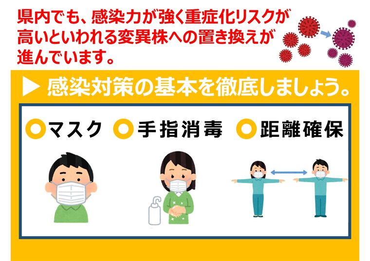 本県の感染状況をみますと、年末年始の人の移動等に伴う感染拡大に加え、最近では、家庭内感染や知人間の感染事例が増加していることから、身近な家族や職場などのコミュニティ内における感染防止対策が極めて重要であると考えられます。