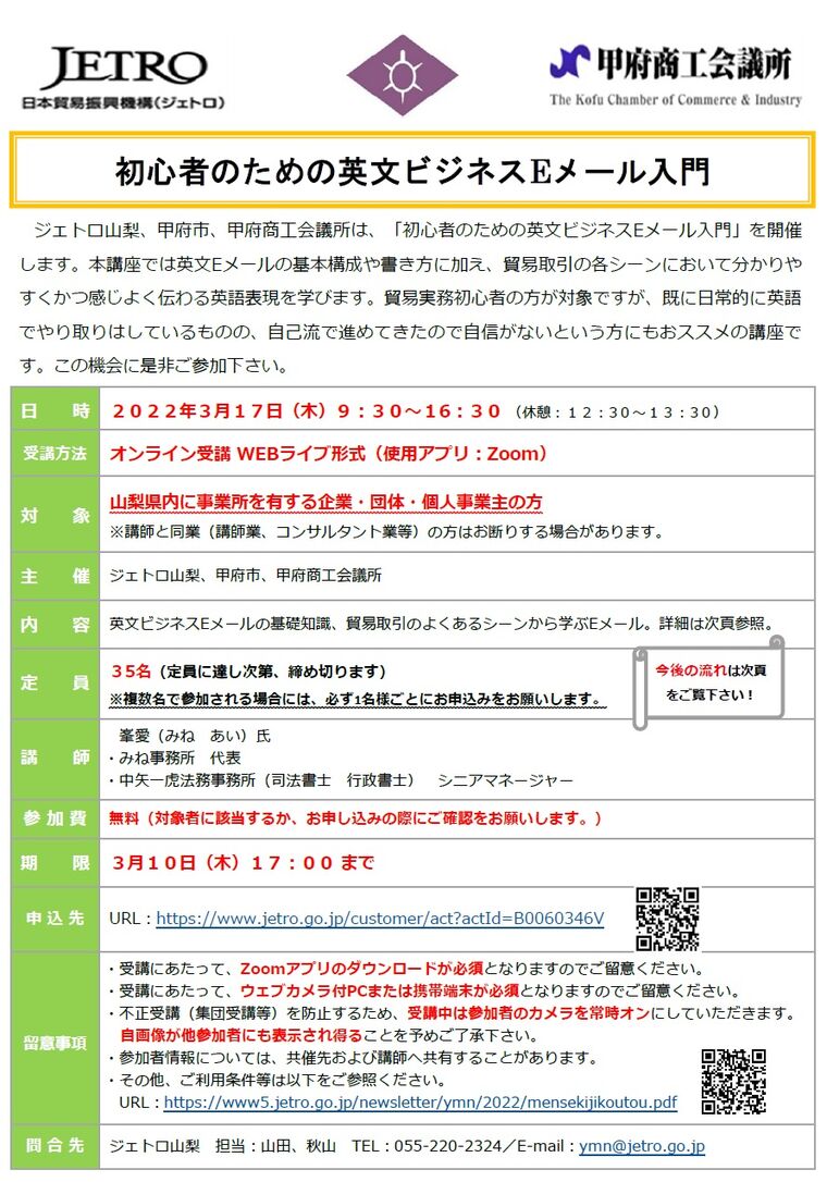 ジェトロ山梨、甲府市、甲府商工会議所は、「初心者のための英文ビジネスEメール入門」を開催