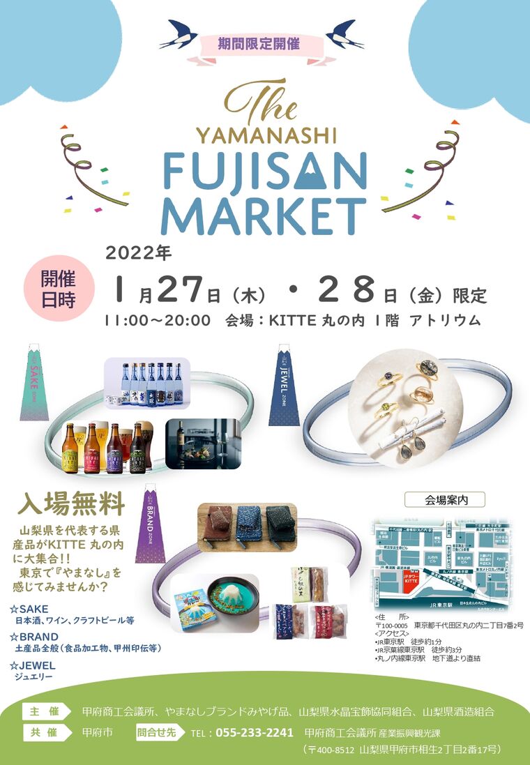 下記の通り実施いたしますので、多くの皆様のご来場をお待ちしております。開催日時 2022年1月27日(木)・28(金)11:00~20:00 会 場 KITTE丸の内 1階アトリウム(東京都千代田区丸の内2丁目7−2) 販売商品 日本酒・ワイン・クラフトビール、土産品全般、ジュエリーなど 主 催 甲府商工会議所