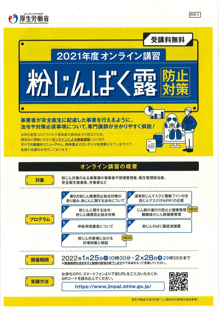 【厚生労働省】第9次粉じん障害防止総合対策の推進に係る講習動画配信について