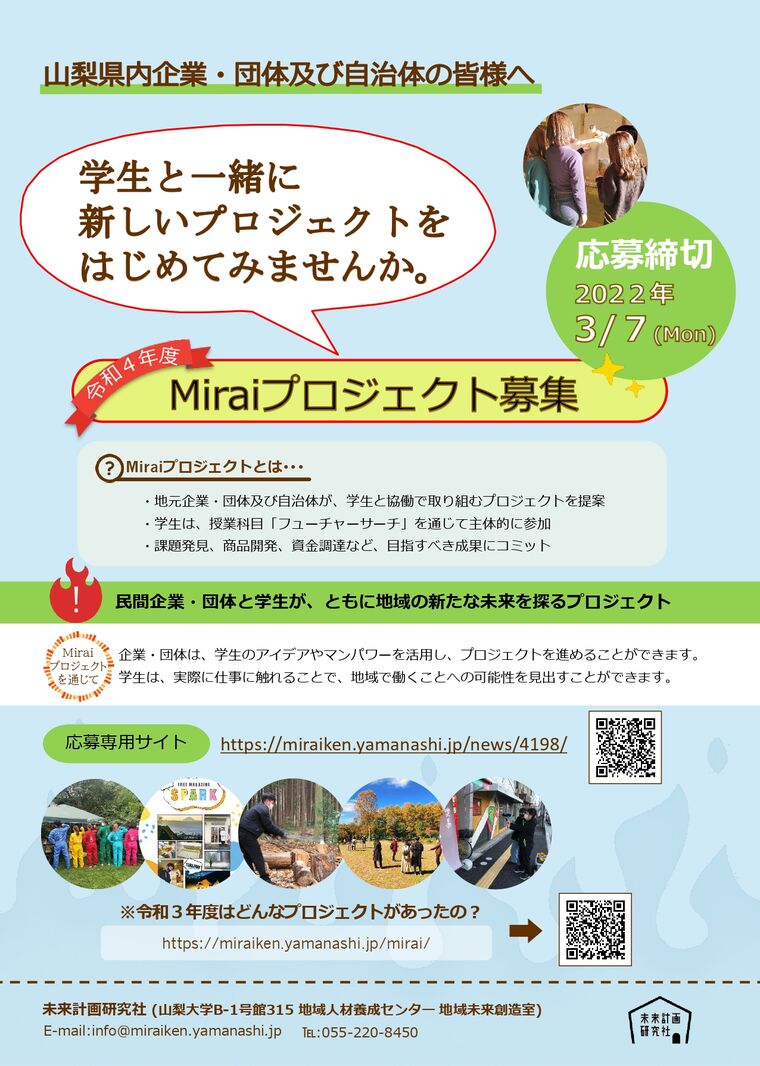 【山梨大学地域人材養成センター】令和4年度Miraiプロジェクト募集のご案内