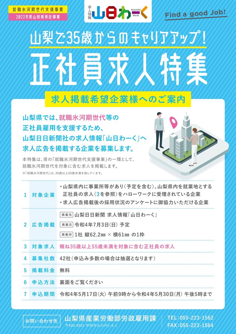 山梨県では、就職氷河期世代等の正社員雇用を支援するため、山梨日日新聞の求人情報「山日わーく」へ求人広告を掲載する企業を募集します。