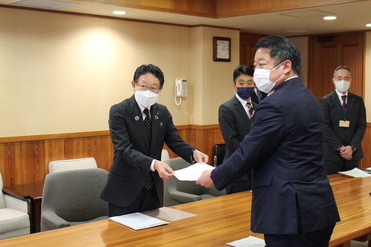 ▲長崎知事に要望書を手交する進藤会長(左)