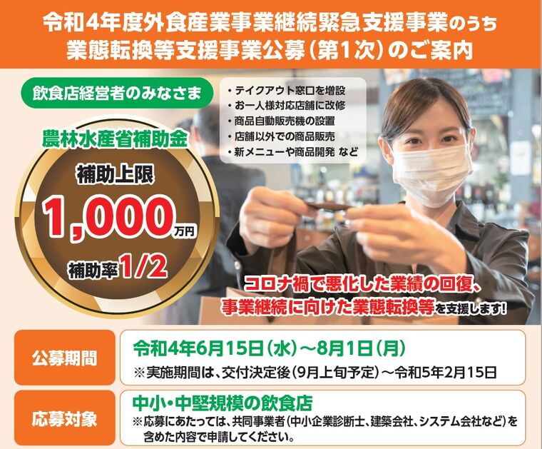補助金: 上限1,000万円以下(下限 100万円)令和4年6月15日(水)~8月1日(月)応募受付期間