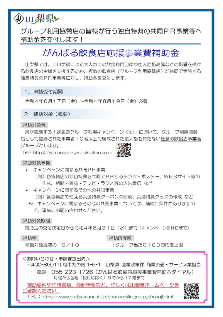 電話:055-223-1726(がんばる飲食店応援事業費補助金ダイヤル) 月曜から金曜(祝日は除く)9時から 17 時まで