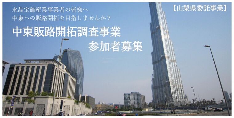 当所では、ジュエリー産地山梨の有力な販路としてアラブ首長国連邦(UAE)を中心とする中東諸国を捉え、販路開拓のための調査および調査を踏まえた中東進出に参加する企業を裏面の募集要項により募集します。中東への進出にご興味のある水晶宝飾産業事業者の皆様は、本事業へのご参加を検討ください。