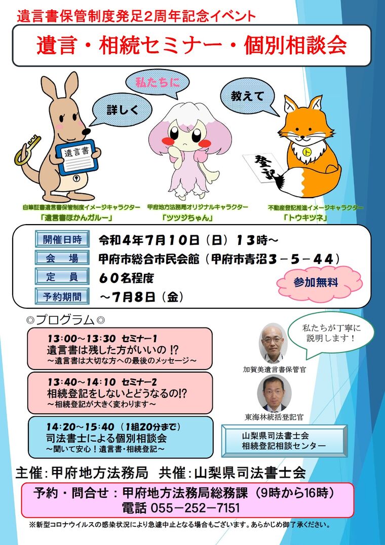 【甲府地方法務局】遺言・相続セミナー・個別相談会の開催について